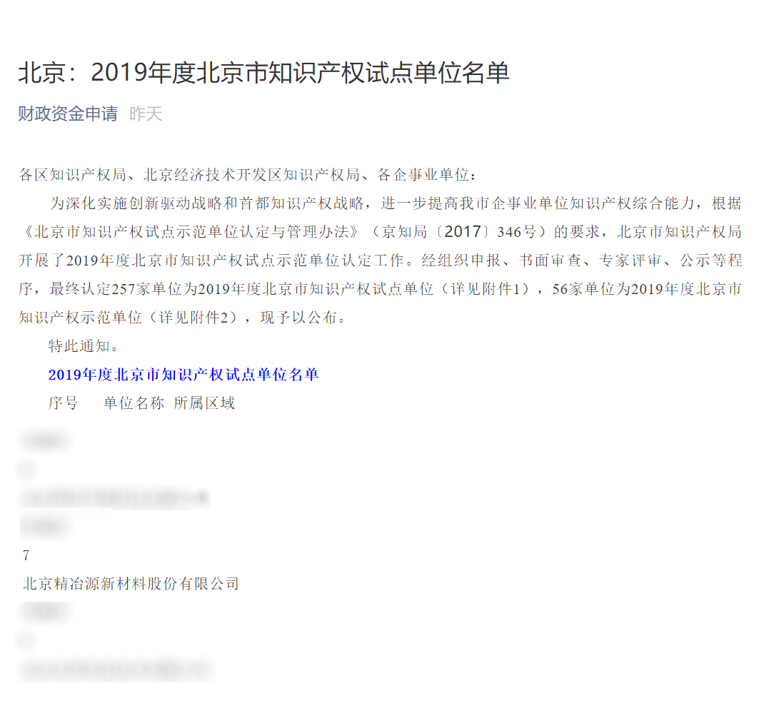 2019年12月下旬,北京精冶源新材料股份有限公司(簡稱:精冶源;股票代碼:831091)歷經(jīng)嚴(yán)格而規(guī)范的書面審查、專家評(píng)審、公示等多項(xiàng)程序,被北京市知識(shí)產(chǎn)權(quán)局認(rèn)定為2019年度北京市知識(shí)產(chǎn)權(quán)試點(diǎn)單位。 此次認(rèn)定要求企業(yè)屬于知識(shí)產(chǎn)權(quán)密集型產(chǎn)業(yè)領(lǐng)域,有持續(xù)創(chuàng)新活動(dòng),有一定數(shù)量的專利申請(qǐng)且近三年專利實(shí)施率不低于40%等多…